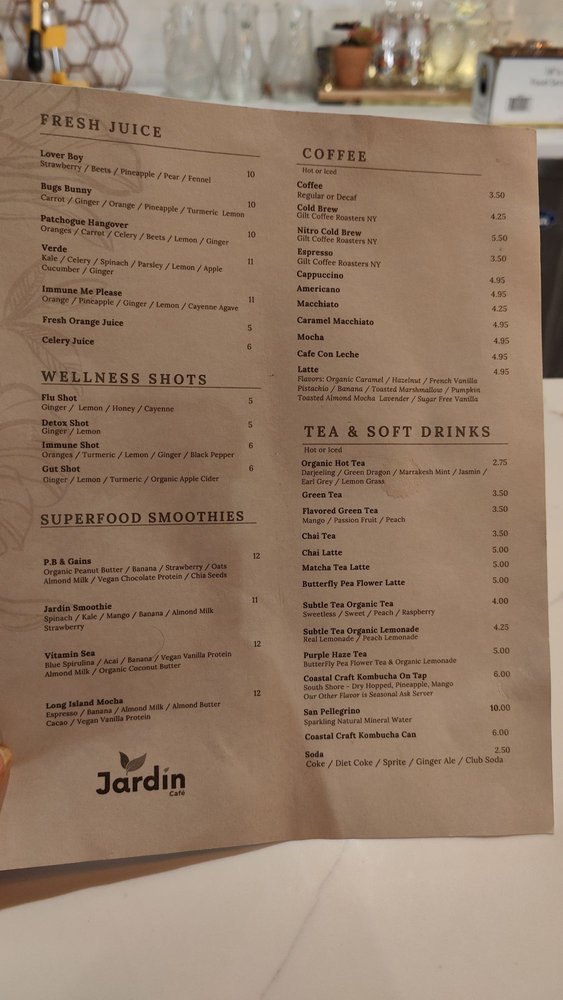 Jardin Cafe, a New American restaurant located in Patchogue, NY, offers a diverse menu with options for vegans and those looking for gluten-free choices. Their fresh-squeezed juices like Bugs Bunny Carrot and Immune Me Please are a hit, along with their avocado toast variations and wellness shots such as the Detox Ginger. Customers rave about the cafe's fresh and delicious food, friendly service, and lovely decor. The latte is particularly highlighted as one of the best on Long Island. The ambiance, coupled with accommodating staff and a wide range of Latin-inspired dishes, make Jardin Cafe a must-visit spot. Although prices may be higher, the quality of the food and service justify the cost for a memorable dining experience.